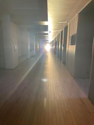 【今の時期しか見られない、明石台小学校1階廊下の朝焼け】