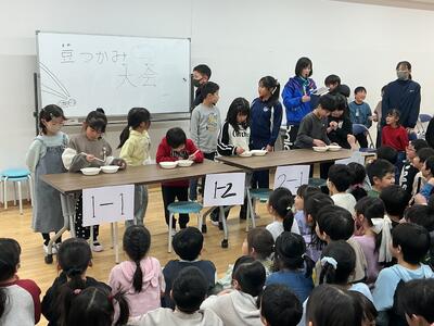 3日連続で給食委員会主催の「豆つかみ大会」が行われました。