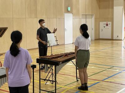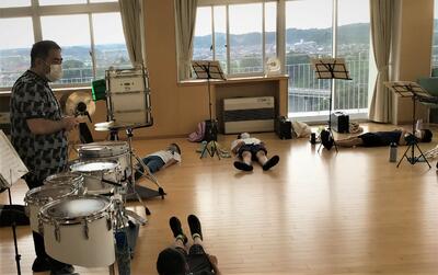 9月の県大会に向け,毎日練習を続けている金管バンドです。今日は講師の先生をお招きしての特別レッスンです。腹式呼吸の仕方から丁寧にご指導いただきました。