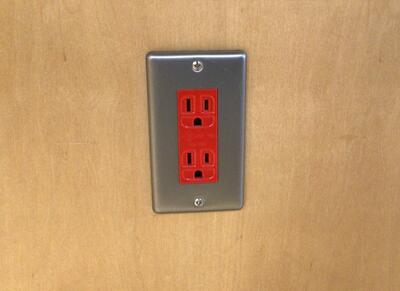 実は本校には「赤いコンセント」が壁に埋め込まれている場所が数カ所あります。これは,太陽光による蓄電池につながっていて,非常時に電源を切り替えることで使用することができるものです。せっかくの機会なので,停電作業中に切り替えて作動させてみました。通常の電源と同様に使用することができ,いざという時に頼りになることが分かりました。